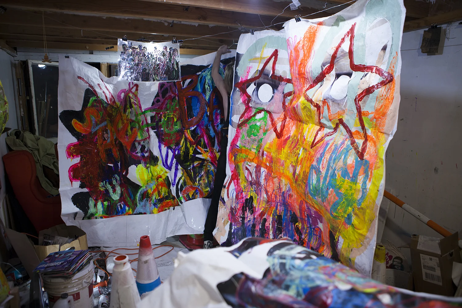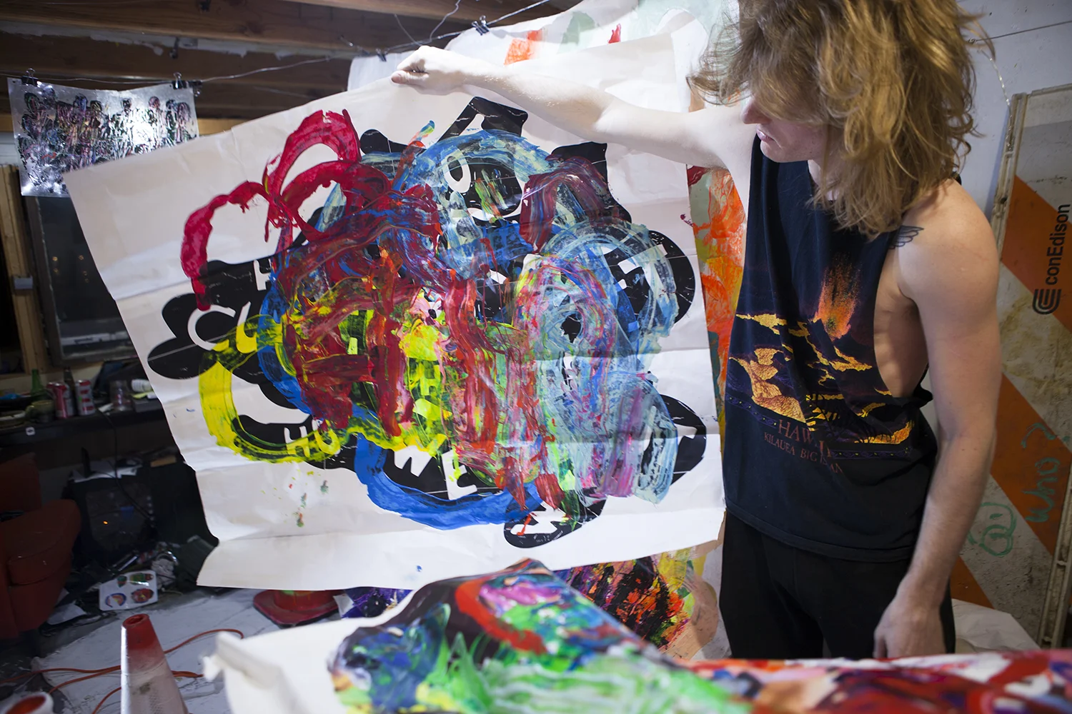 His current work is large and colorfull. Using common ingredients like packing tape, pieces of ordinary paper, laser prints, traffic cones, tires, pvc piping or paint, he constructs large energetic paintings from inexpensive materials.